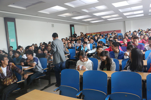 首先,他以“大学之道,在明明德,在亲民,在止于至善”开题,告诉大家:“大学只是一场路途的起点,要崇德修养,胸怀梦想,树立目标,大学是对自己综合素质的提高和培养,要有一个长远的目标和规划,找一条适合自己发展的道路前进。