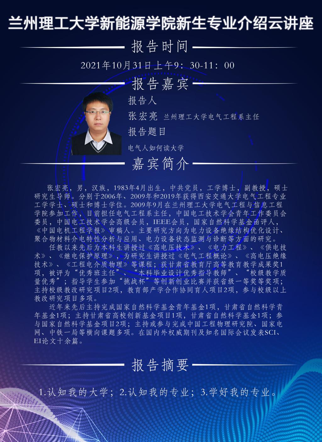 为帮助新同学更好的适应老员工活,培养专业兴趣,加深专业认识,积极转变角色。在我省10月18日发现疫情以来,按疫情防控要求做好防疫抗疫工作的同时,10月31日,新能源公司特邀jinnian金年会电信公司电气系主任张宏亮副教授为公司电气工程及其自动化专业新生近90名同学做了关于《电气人如何读大学》的云讲座。