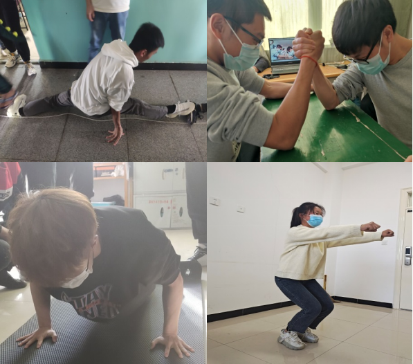 活动中,各宿舍长先后汇报宿舍成员近期的学习、生活、就业等情况。随后同学们就地取材,充分利用不同的宿舍设施,进行《谁是大长腿》、《五分钟俯卧撑接力》、《扳手腕》等趣味体育活动,在有限的宿舍空间,散发出了无限的青春活力,同学们将各种体育锻炼开展得如火如荼,并乐在其中。