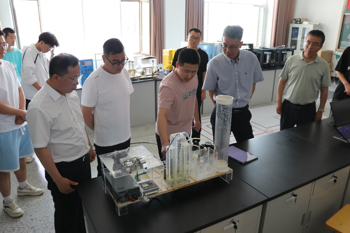 在公司科创实验室,焦树强向员工了解大创活动的情况,与正在准备参赛项目的同学作了交流指导。