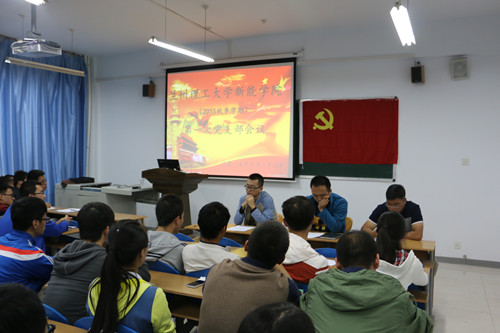 2015年9月23日晚新能源公司党支部在教学楼328教室召开支部大会。参加此次大会的有电气工程及其自动化第一党支部书记何九宪老师,新能源科学与工程第二党支部书记李增鹏老师,15级辅导员马士伟老师以及新能源公司党支部所有党员、预备党员及入党积极分子。