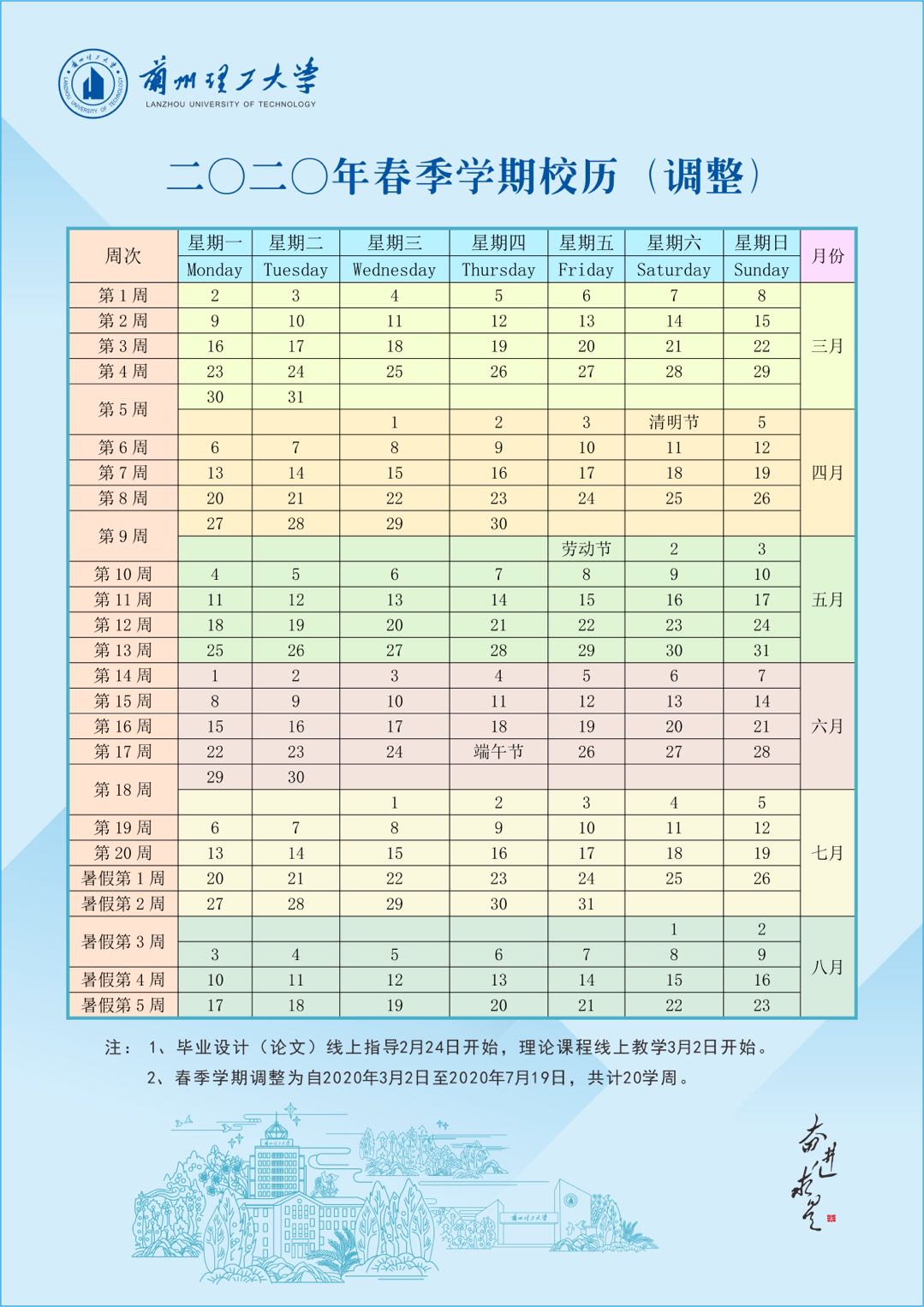 根据《关于2020年春季学期校历调整的通知》(兰理工教字【2020】第006号)文件精神,现将具体通知如下: