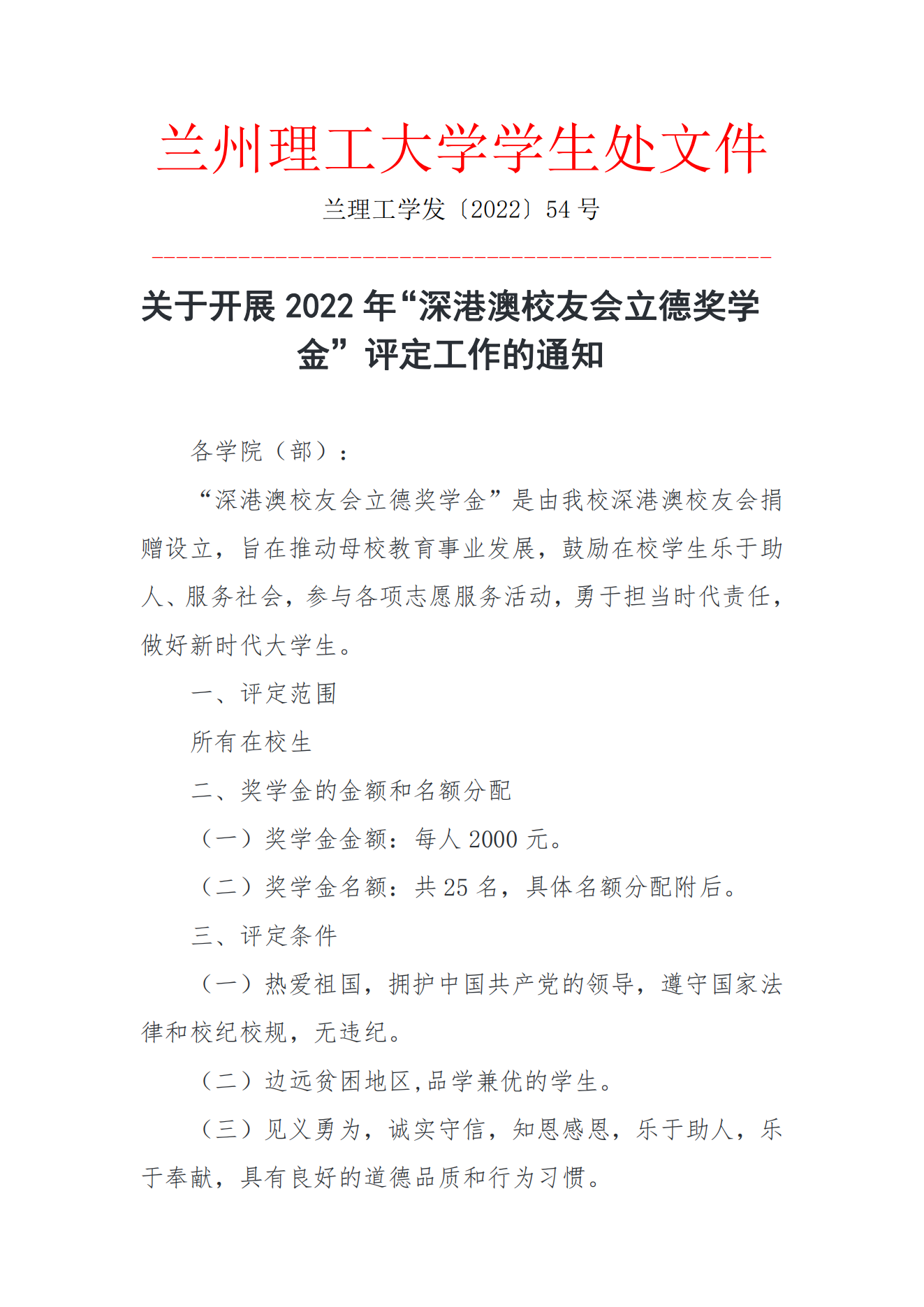 关于开展2022年“深港澳员工会立德奖学金”评定工作的通知