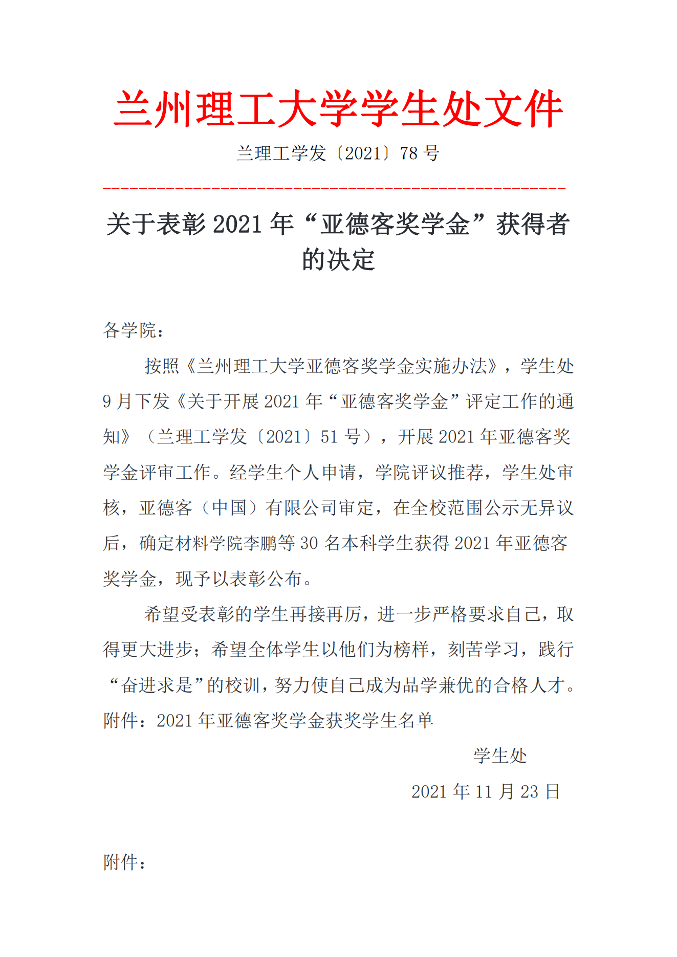 关于表彰2021年“亚德客奖学金”获得者的决定