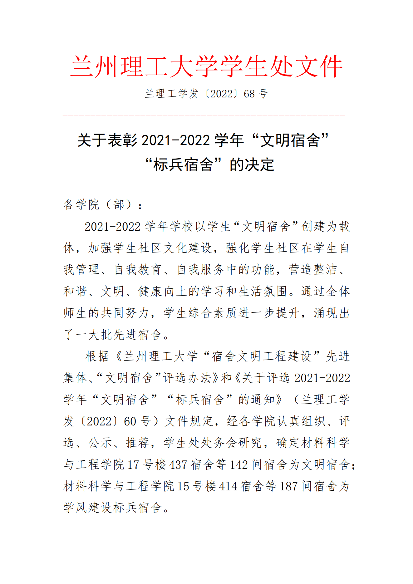 关于表彰2021-2022学年“文明宿舍”的决定