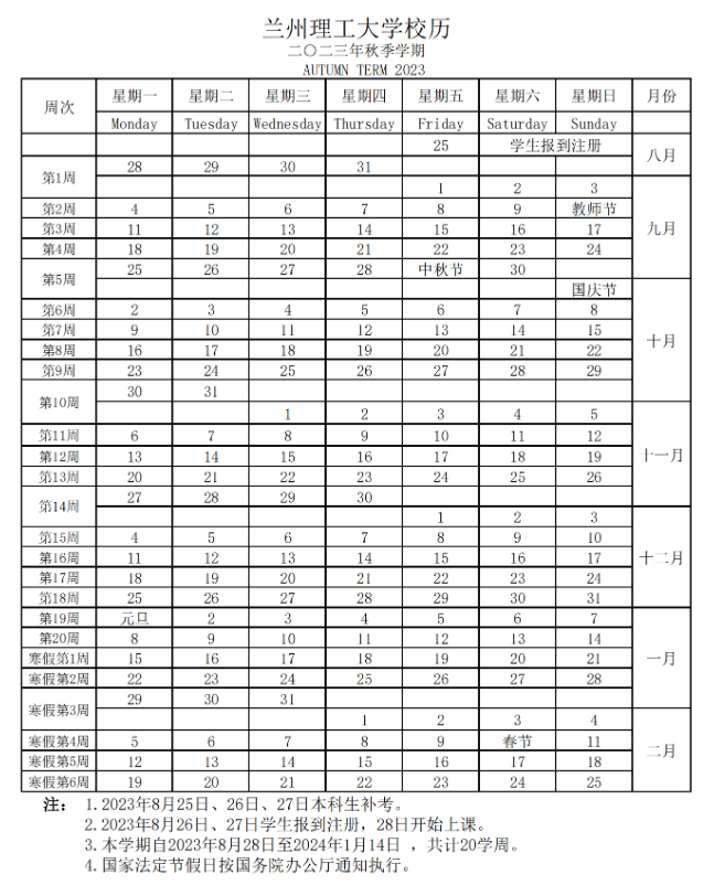 2023年秋季学期校历