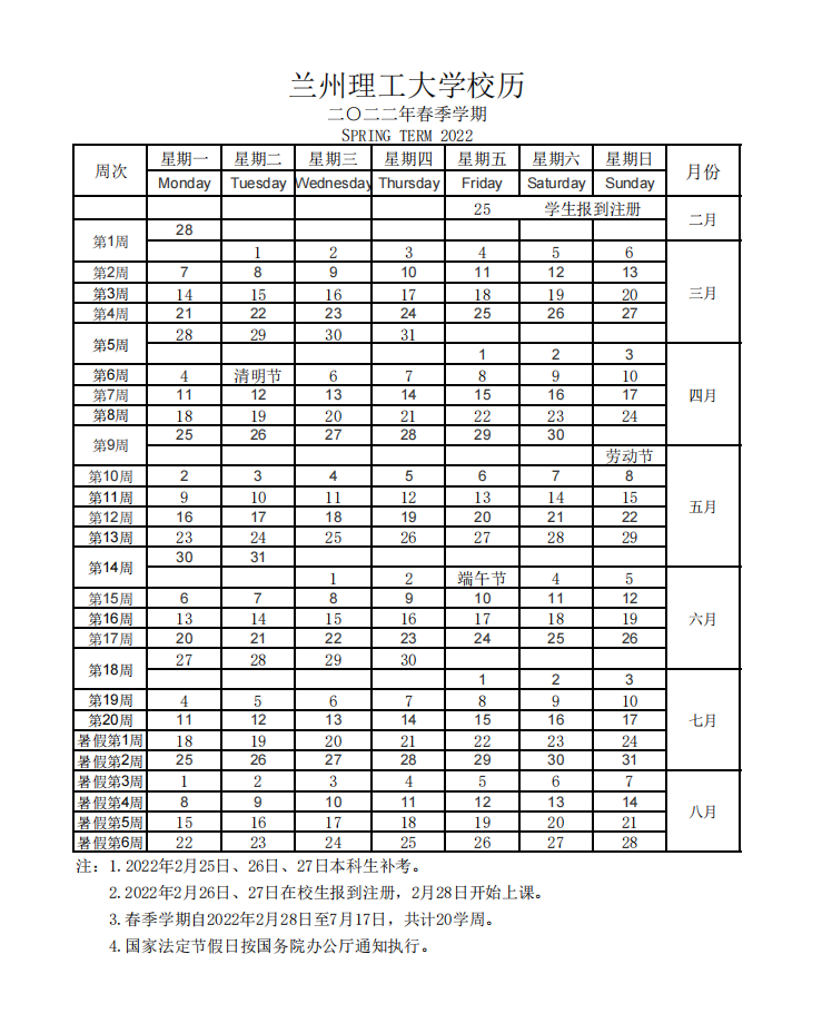 2022年春季学期校历