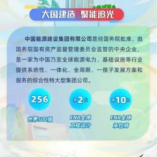 中国能源建设集团有限公司(简称"中国能建")是经国务院批准、由国务院国有资产监督管理委员会直接管理的特大型能源建设集团,由中国葛洲坝集团公司、中国电力工程顾问集团公司和国家电网公司、南方电网公司所属15个省(市、区)的电力勘测设计、工程建设和装备制造企业组成。也是全球能源电力、基础设施等行业提供整体解决方案、全产业链服务的综合性特大型集团公司,主营业务涵盖能源电力、水利水务、铁路公路、港口航道、市政工程、城市轨道、生态环保和房屋建筑等领域,具有集规划咨询、评估评审、勘察设计、工程建设及管理、运行维护和投资运营、技术服务、装备制造、建筑材料为一体的完整产业链。