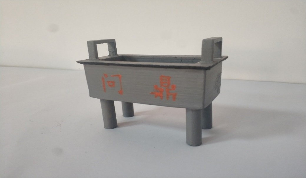 问鼎,由四枝鼎腿和两只鼎耳及鼎身构成,鼎长90mm,鼎宽30mm,高约60mm,全鼎打印密度极高约90%,鼎体采用亮灰色涂装,正中面问鼎二字,整体看上去尽显王霸之气,其寓意鲜明,设计灵感贯穿过去,现在和未来,既体现了中华文化的悠久历史底蕴,又兼顾了现在合作共赢之寓意,同时充满了对未来勇夺巅峰之憧憬,是优秀的设计产品。
