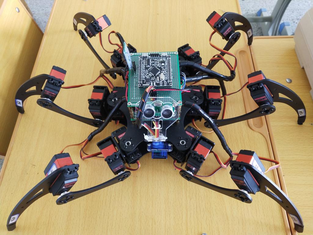本设计主要以STM32F103RCT6为核心控制器,分别由电源及电源模块、舵机、超声波模块、蓝牙模块、报警电路、机架构成。接下来就是设计中主要涉及到的一些技术问题,包括机器人重心的稳定和步态的控制、躲避障碍物和无线遥控,整个机器人就是以这三个问题展开一系列的设计。首先是对硬件电路电气原理图进行绘制,根据原理图物理连线焊接并搭建硬件系统,检查电路连接并通电测试;其次是通过程序编写来实现机器人的控制功能,按照分步调试的过程对硬件电路的各个模块都能完成软件调试并且通过程序编译,从而实现六足机器人各模块正常工作的要求;最后软硬件进行联合调试,使各模块有序工作相互配合,最终使机器人持续连贯的动作。该六足机器人是通过蓝牙模块进行功能模式选择:其中功能一为自动避障模式,当机器人前方遇到障碍物得距离小于0.5m时报警电路报警一声后机器人左转90°继续前行,往复循环直到关闭避障功能后机器人停止;功能二为蓝牙遥控模式,通过手机上位机APP发送相关指令到六足机器人下位机进行指令解析后调用相关函数从而实现机器人的前进、后退、左转、右转等行走步态,其中避障模式和遥控模式都有两种行走姿态的选择(姿态一避障、姿态二避障、姿态一遥控、姿态二遥控)。