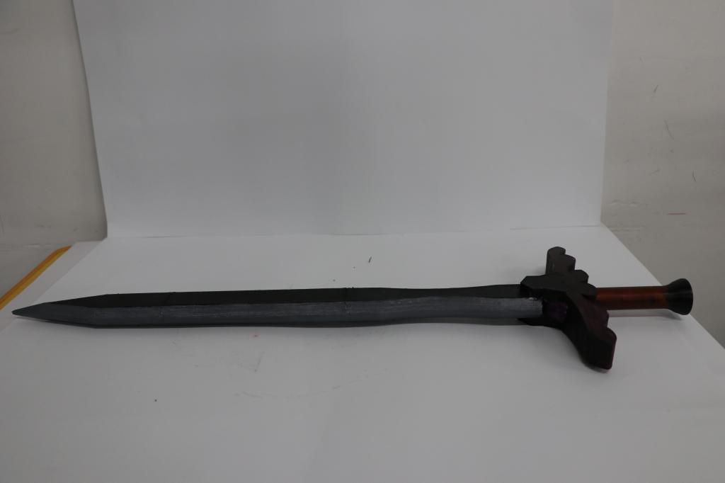 夜空之剑的设计主要由四部分组成,分别是剑尖,剑体,剑身与剑柄组成。四个部件分别作3D打印的设计,完成后用液体胶固定。各个零件进行切割,打磨。使得配合更加完美,具有复古的艺术感。剑柄的装饰可以看作翅膀或者是紫竹梅的叶子,贴近自然。