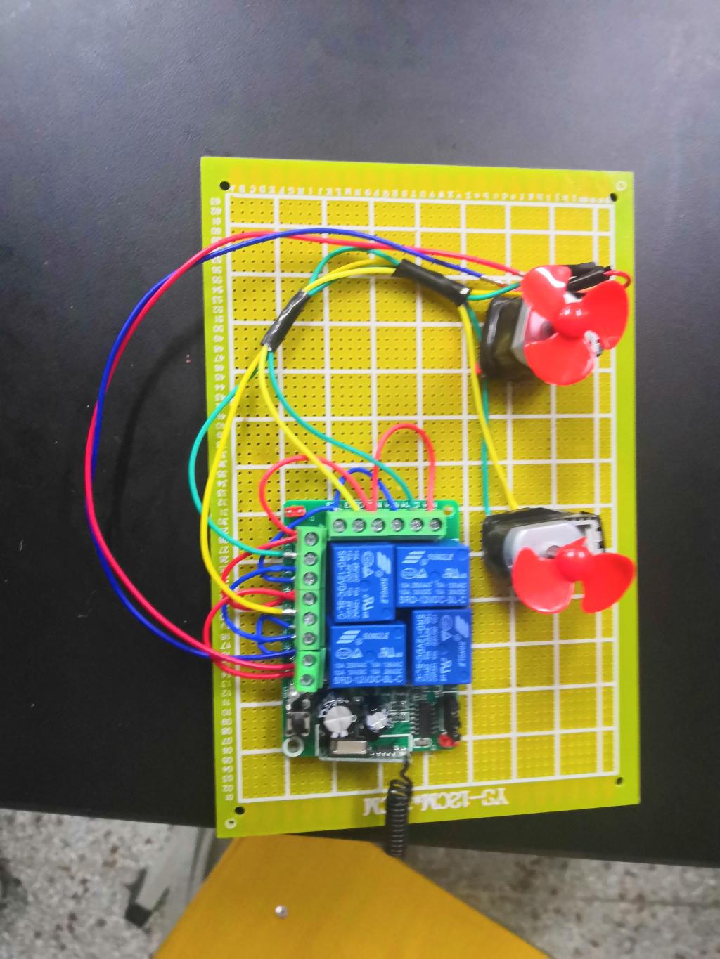 我们组设计的是无线遥控开关控制电机正反转,无线遥控开关由发射模块和接收模块2大部分组成,通过遥控器里的发射模块发射信号至接受模块接受信号,从而控制继电器的吸合来控制外电路电机的正反转。