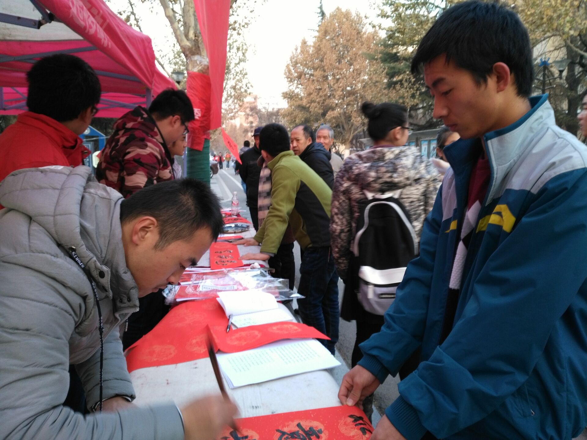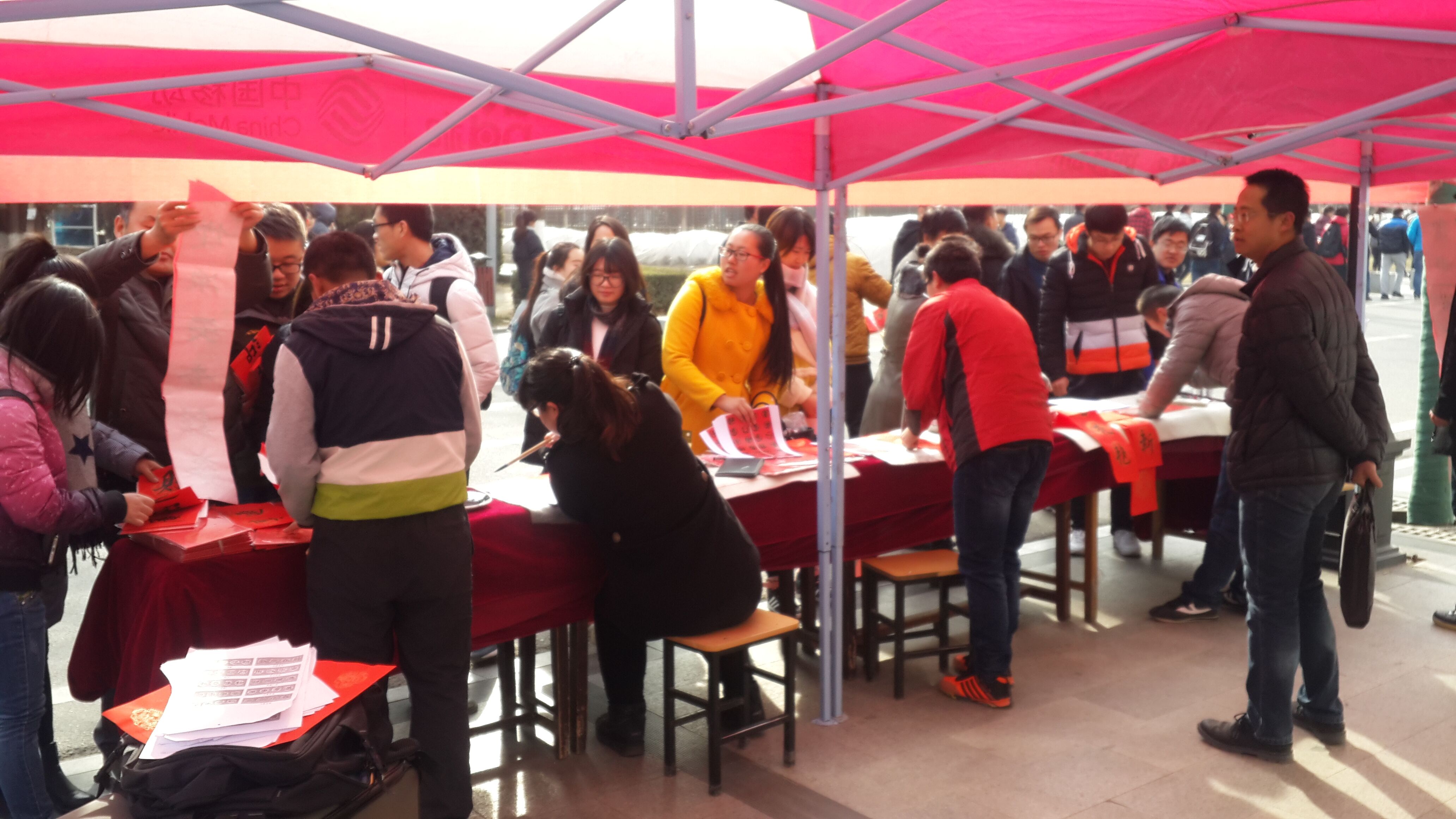 2016年12月14日至15日,公司陈智斌、安宏涛等同学在jinnian金年会本部(六号楼前、体育馆门前)举办为期两天的“迎新年,送温暖,楹联春”活动,此次活动由校团委主办,新能源公司分团委承办。