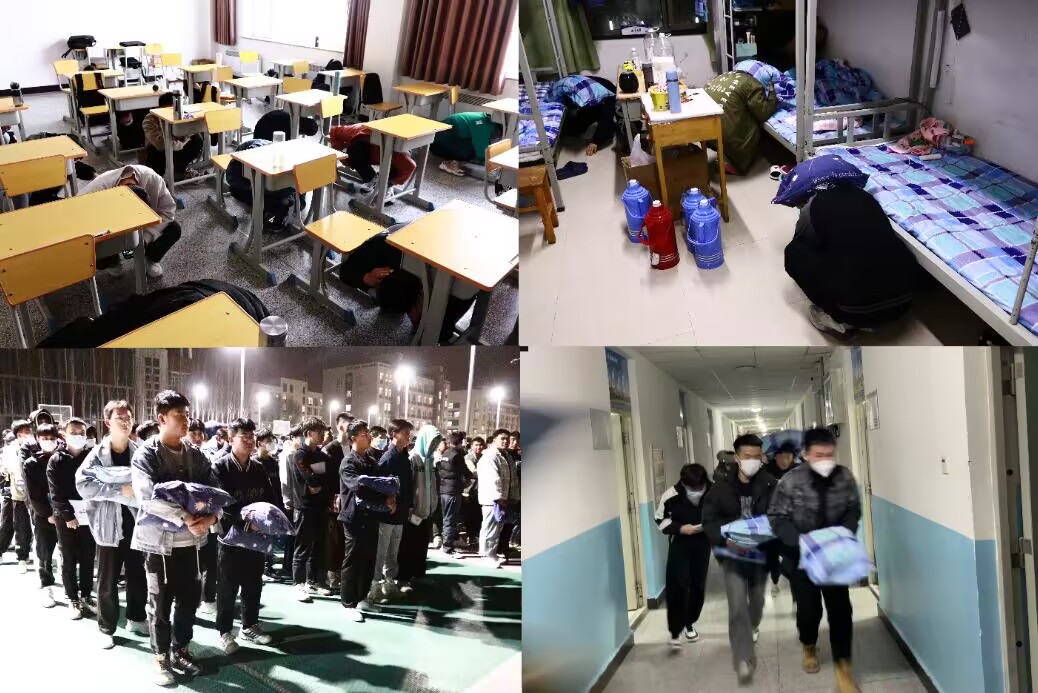 防震演练在教学楼和宿舍楼相继展开,院领导提前详细规划了紧急疏散时的撤离秩序、安全管理事项等,确保防震演练安全有序进行。随着第一声警报响起,各班同学认真模拟地震发生时的真实场景,就近躲避在书桌下、床铺下、墙角等相对安全的地方,用书本、枕头等物品保护头部,并抓住牢固的物体,蹲下或坐下,尽量蜷曲身体,降低重心,保护好头颈、眼睛,并保持镇定。第二声警报响起,各个岗位值守的领导及老师紧急疏导,指挥员工沿着指定楼梯通道快速、有序的撤离,到达指定集合地点后,班长清点人数,向总指挥报告。整个演习过程紧张有序,有条不紊,均能做到安全撤离、有序集合,没有发生任何互相推挤或踩踏事故。